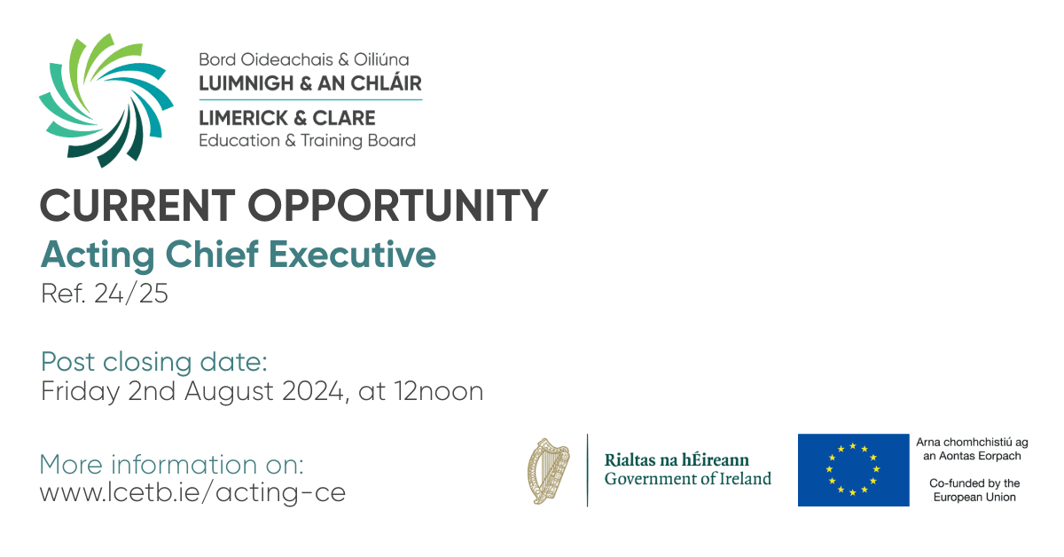 Limerick and Clare Education and Training Board invites applications from suitably-qualified persons to fill the vacancy of Acting Chief Executive. As this is an acting position, this competition is open to eligible and suitably-qualified staff of Limerick and Clare Education and Training Board only.