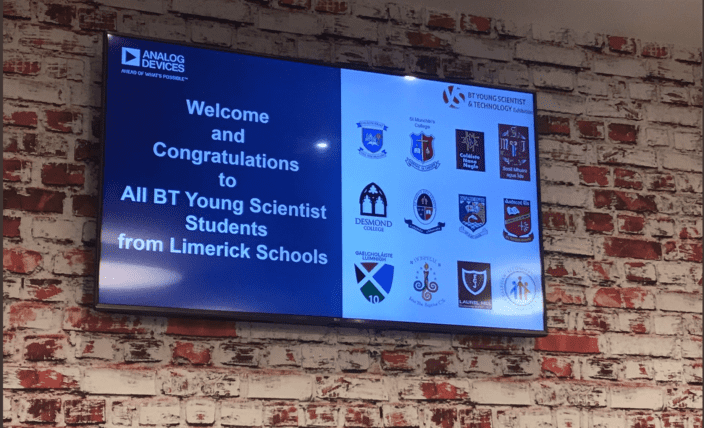 Students of the 12 schools from Limerick that participated in the BT Young Scientist and Technology Exhibition 2019, including the 13 students from Desmond College were guests in Analog Devices at their European headquarters in Raheen Business Park on Wednesday 6th of February. There was a panel of past participants of the exhibition who offered career and subject choice advice to the students. The event was organised by Brian O’ Meara and Annie O’ Sullivan who were joined on the night by two Vice Presidents of Analog Devices.