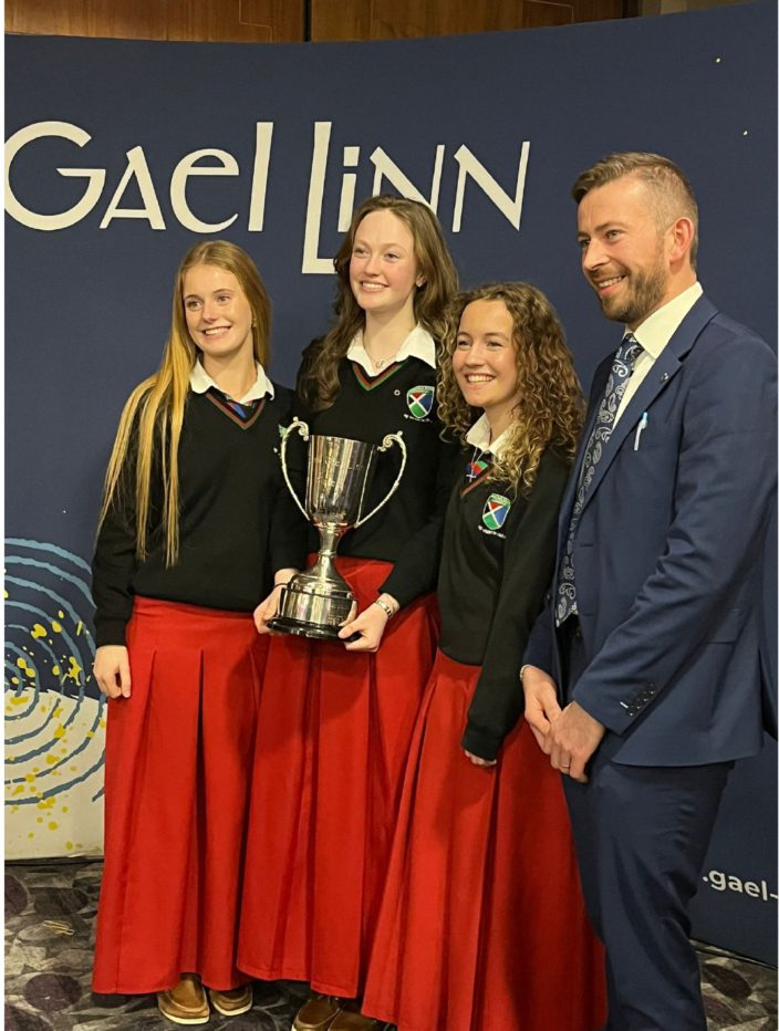 The winning senior team comprised Neasa Ní Ifearnáin, Ava Ryan, and Lía O’Donoghue, under the guidance of their teacher, John de Buitléir. The national competition, organised by Gael Linn for Irish-medium post-primary schools, took place at Athlone Springs Hotel on Wednesday, 21 January.