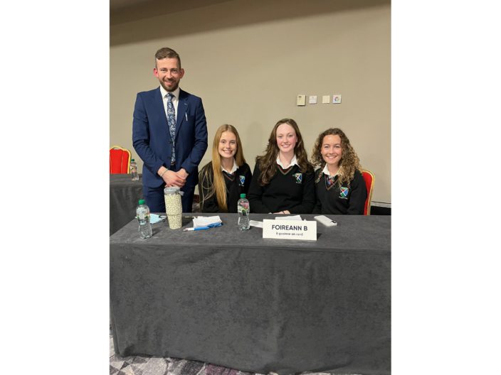 Bua stairiúil do Ghaelcholáiste Luimnigh! Neasa Ní Ifearnáin, Ava Ryan agus Lía O’Donoghue bhuail na foirne is fearr in Éirinn i gComórtas Díospóireachta Uí Chadhain 2026, faoi threoir John de Buitléir.