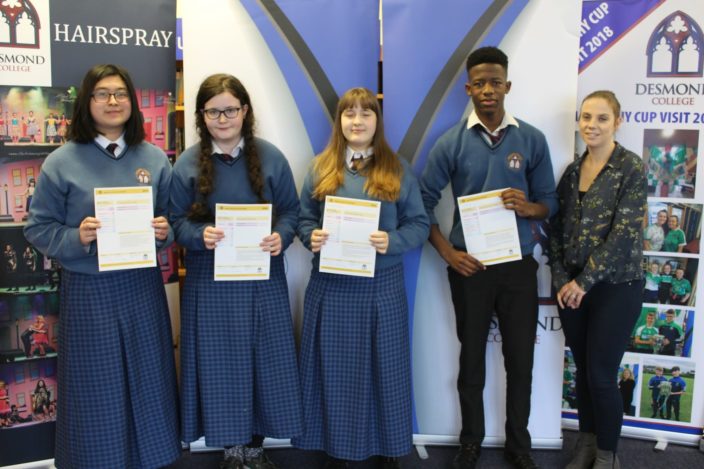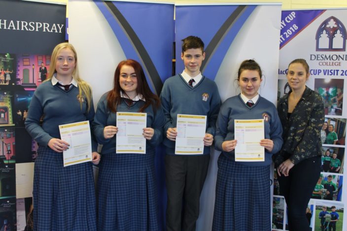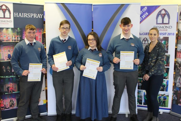 Yvonne Leahy, Aimee Kenny, Matthew O Connor and Megan Romo receiving their JCPA Certificates with Ms Corkery