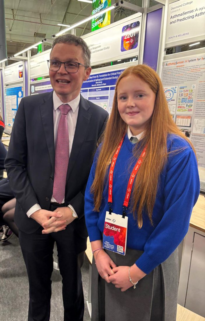 Nell McMahon, Desmond College, took 3rd place in the Intermediate Health & Wellbeing category for AsthmaSense being congratulated by Minister Patrick O’Donovan TD is Minister for Culture, Communications and Sport Patrick O’Donovan.