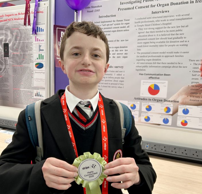 John Shanahan, Coláiste Chiaráin, Croom Highly Commended in the Junior Health and Wellbeing category for his project on public awareness of presumed consent for organ donation in Ireland.