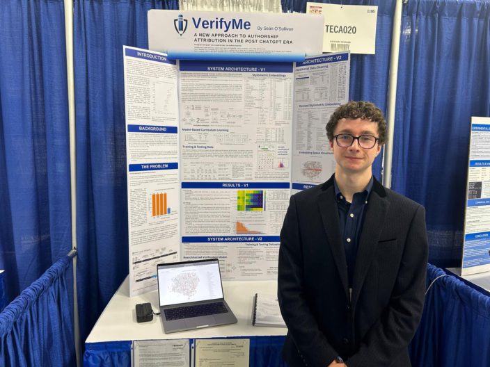 Seán, the 2024 winner of the BT Young Scientist and Technology Exhibition (BTYSTE), achieved fourth place in the “Technology Enhances the Arts” category at ISEF with his innovative project, VerifyMe. His work focuses on the development of an artificial intelligence (AI) detection system that analyses an author’s previous writing to determine whether AI was used in generating a new piece of work.
